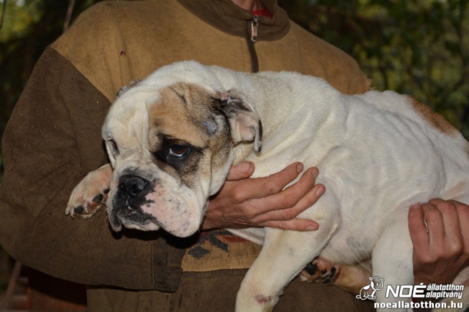 Kiszabadítottuk Olliet, a fehér bulldogot Mátészalkáról, ahogy egy 40 cm-es láncon, vészesen lesoványodva, krónikus hasmenéstől kínozva élt.